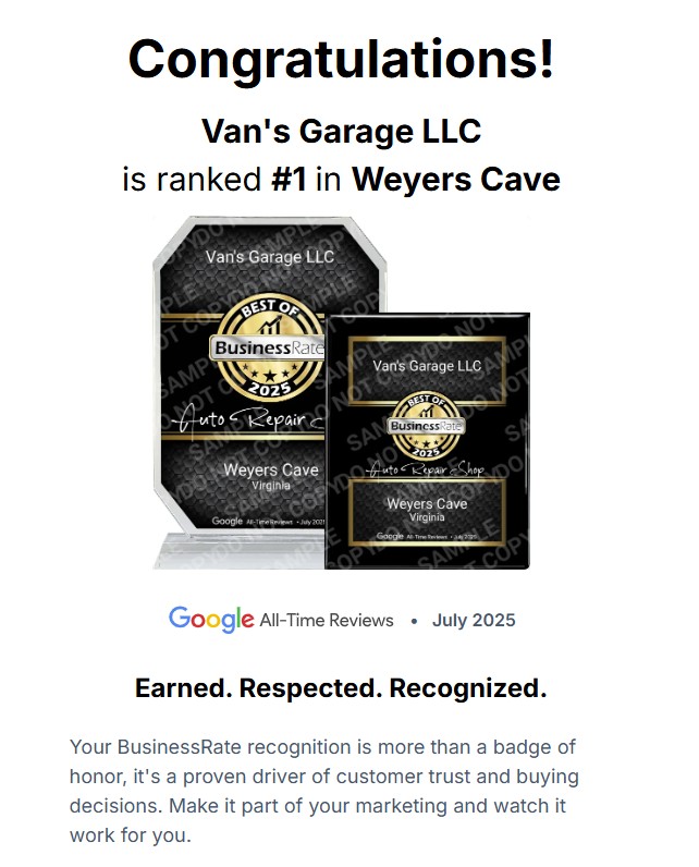 Best in Weyers Cave Award Many thanks to BusinessRate which has ranked Van’s Garage #1 in Weyers Cave for 2025!